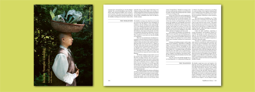 In addition to recipes, there are also many narrative passages in this cookbook. I ensured readable line spacing, avoided stacks, and avoided hyphenation of proper nouns as well as Korean words. If I had to hyphenate a Korean word, I tried to ensure they were introduced previously, so the word was already familiar to the reader.